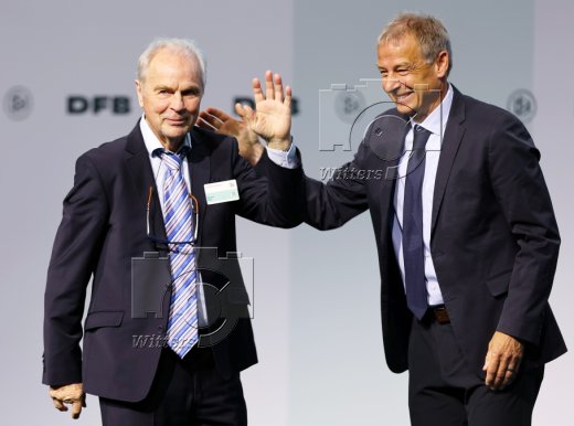 Ernennung von Bernard Dietz zum DFB-Ehrenspielfuehrer, v.l. Bernard Dietz, Laudator Juergen Klinsmann, DFB-Praesident Bernd Neuendorf