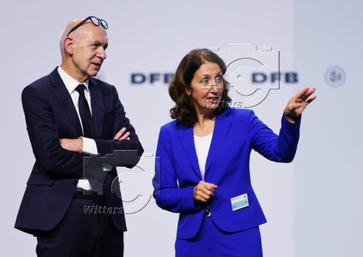 v.l. DFB-Praesident Bernd Neuendorf, Aydan Oezoguz (Vorsitzende des Sportausschusses des Deutschen Bundestages)
