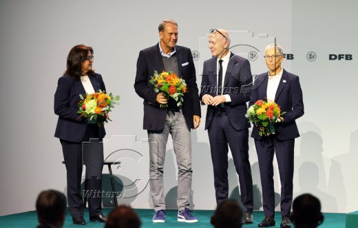 v.l. DFB-Generalsekretaerin Heike Ullrich, DFB-Vizepraesident Steffen Schneekloth, DFB-Praesident Bernd Neuendorf, DFB-Vizepraesidentin Sabine Mammitzsch