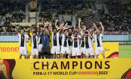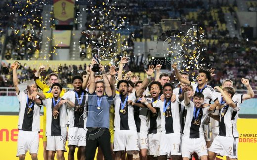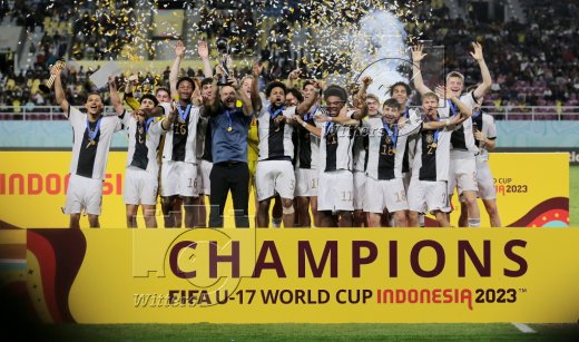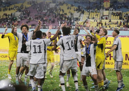 Deutschland U17 Weltmeister 2023, Trainer Christian Wueck (Deutschland) mit WM-Pokal und Team