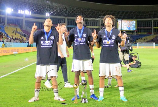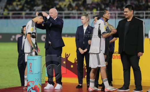 Deutschland U17 Weltmeister 2023, v.l. Noah Darvich, FIFA-Praesident Gianni Infantino, Paris Brunner (Deutschland)