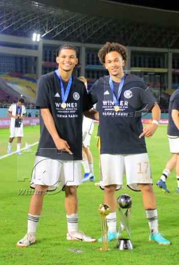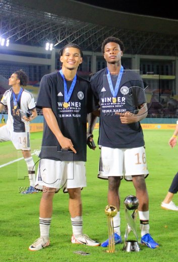 Deutschland U17 Weltmeister 2023, Winners Osawe mit WM-Pokal, Charles Herrmann mit einem Trikot des verletzten Assan Ouedraogo