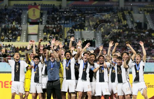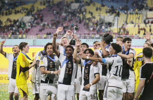 Deutschland U17 Weltmeister 2023, vorn v.l. Fayssal Harchaoui, Trainer Christian Wueck, Noah Darvich mit WM-Pokal, Eric da Silva Moreira, Charles Herrmann