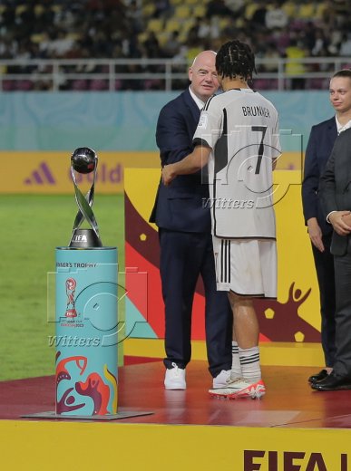 Deutschland U17 Weltmeister 2023, v.l. FIFA-Praesident Gianni Infantino, Ehrung Paris Brunner (Deutschland, bester Spieler und Torschuetzenkoenig)