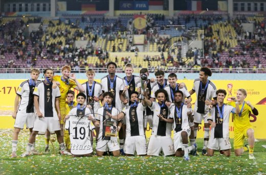 Deutschland U17 Weltmeister 2023, hinten v.l. Kurt Rueger, Paris Brunner, Torwart Konstantin Heide, Torwart Max Schmitt, Maximilian Henning, Winners Osawe, Finn Jeltsch, Robert Ramsak, Maxim Dal, Bilal Yalcinkaya, David Odogu, vorn v.l. Fayssal Harchaoui mit Trikot des verletzten Assan Ouedraogo, Justin von der Hitz, Almugera Kabar, Eric da Silva Moreira, Charles Herrmann, Noah Darvich, Torwart Louis Babatz