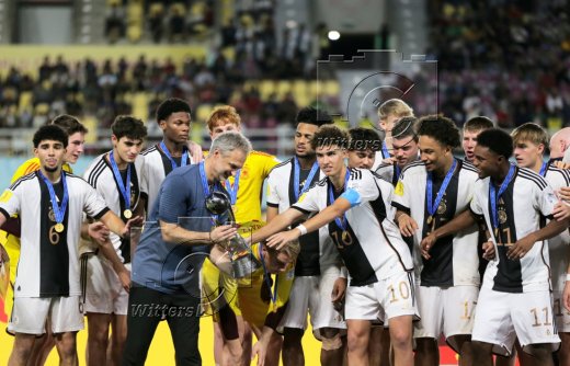 Deutschland U17 Weltmeister 2023, Trainer Christian Wueck mit WM-Pokal