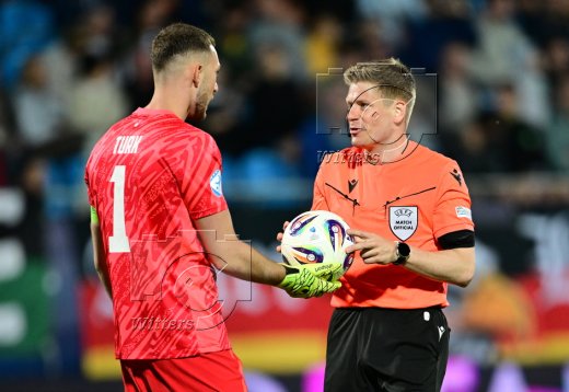 v.l. Torwart Martin Turk (Slowenien), Schiedsrichter Jakob Sundberg (Daenemark)