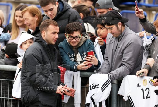 v.l. Bundestrainer Hans-Dieter ''Hansi'' Flick, Niclas Fuellkrug mit Fans