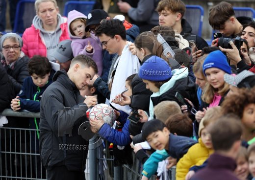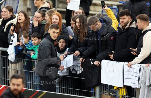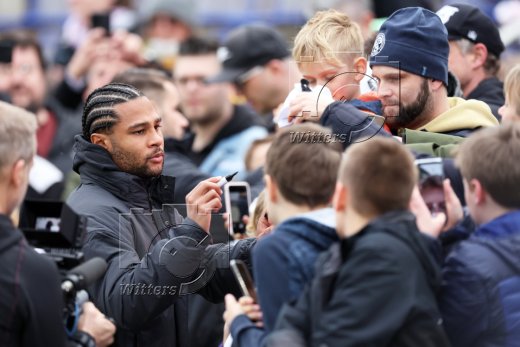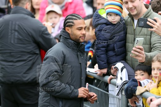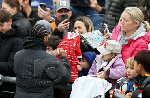 Serge Gnabry mit Fans, Autogramm auf Trikot des FC Bayern Muenchen