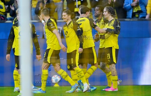 4:0 Tor, Jubel, v.l. Waldemar Anton, Marcel Sabitzer, Ramy Bensebaini, Carney Chukwuemeka, Torschuetze Fabio Silva (Dortmund)