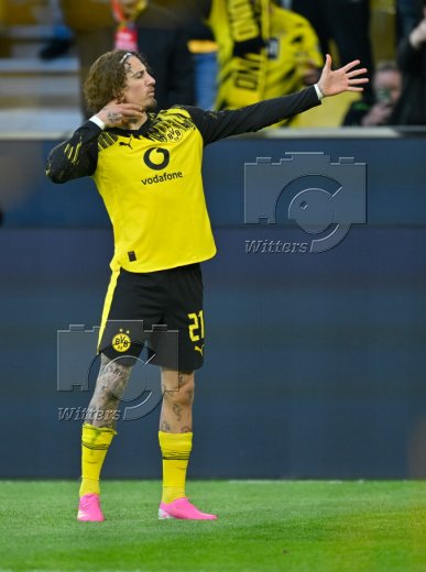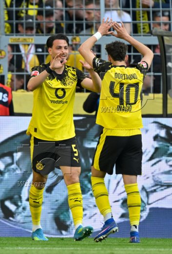 3:0 Tor, Jubel, v.l. Torschuetze Ramy Bensebaini, Samuele Inacio (Dortmund)