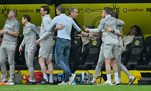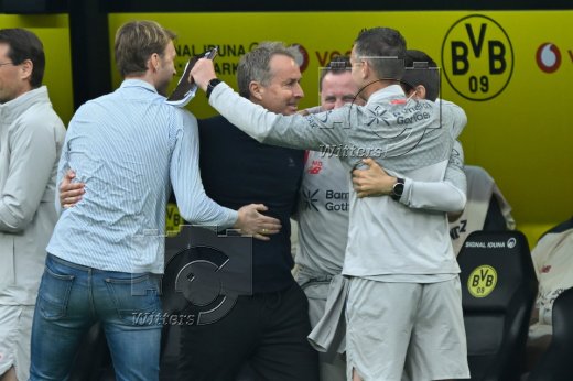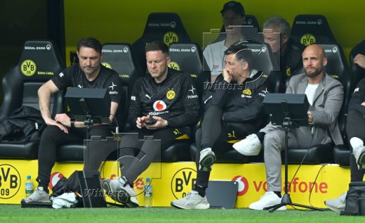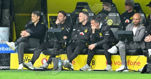 v.l. Trainer Niko Kovac (Dortmund), Co-Trainer Robert Kovac, Co-Trainer und Chefanalytiker Steven Rands, Co-Trainer Filip Tapalovic, Sportdirektor Nils-Ole Book (Dortmund)