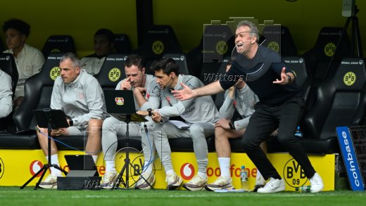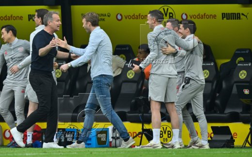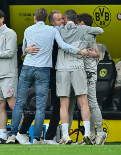 Schlussjubel v.l. Simon Rolfes (Geschaeftsfuehrer Sport, Leverkusen), Trainer Kasper Hjulmand (Leverkusen), Co-Trainer Rogier Meijer, Co-Trainer Sergi Runge