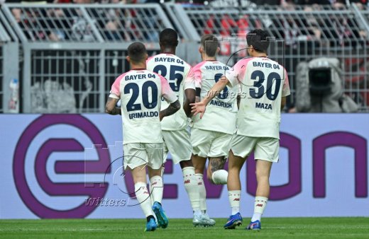 0:1 Tor, Jubel, v.l. Alejandro Grimaldo, Christian Kofane, Torschuetze Robert Andrich, Ibrahim Maza (Leverkusen)