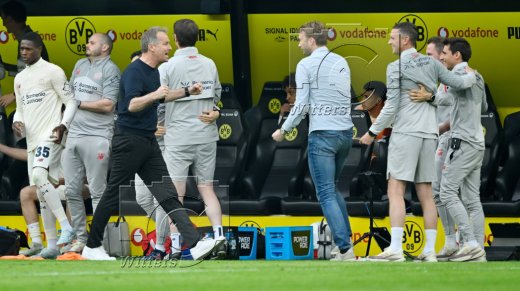 Schlussjubel v.l. Simon Rolfes (Geschaeftsfuehrer Sport, Leverkusen), Trainer Kasper Hjulmand (Leverkusen)