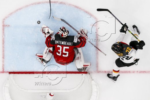 v.l. Torwart Sam Montembeault (Kanada), Dominik Kahun (Deutschland)