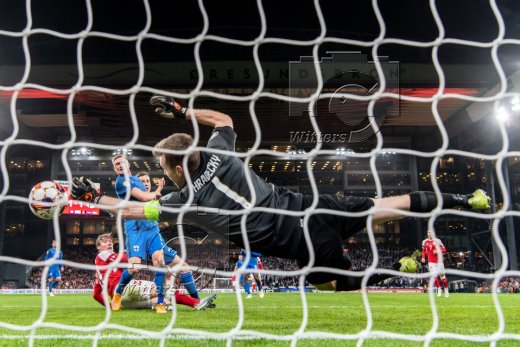 v.l. Joakim Maehle, Torwart Kasper Schmeichel (Daenemark), Joel Pohjanpalo (Finnland)