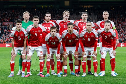 Team (Daenemark, hinten v.l. Torwart Kasper Schmeichel, Pierre-Emile Hoejbjerg, Rasmus Hoejlund, Andreas Christensen, Simon Kjaer, vorn v.l. Christian Noergaard, Joakim Maehle, Mikkel Damsgaard, Alexander Bah, Martin Braithwaite, Mathias Jensen