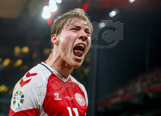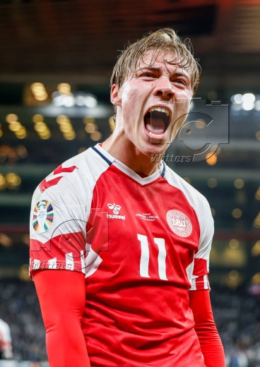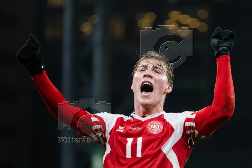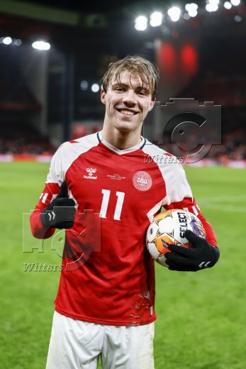 Schlussjubel des dreifachen Torschuetzen Rasmus Hoejlund (Daenemark) mit Spielball