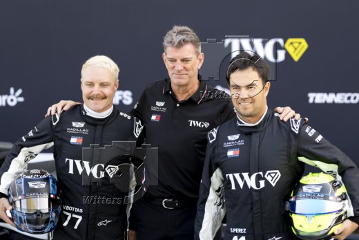 v.l. Valtteri Bottas (Finnland, Cadillac), Graeme Lowdon (Grossbritannien, Teamchef Cadillac), Sergio Perez (Mexiko, Cadillac)