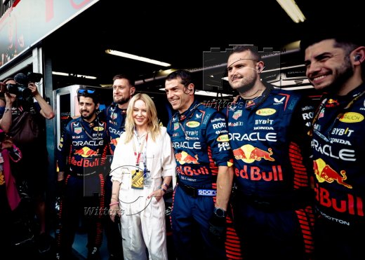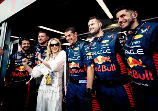 Saengerin Kylie Minogue, mit Teammitgliedern von Red Bull Racing
