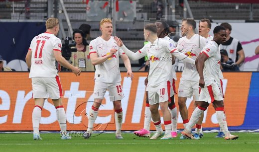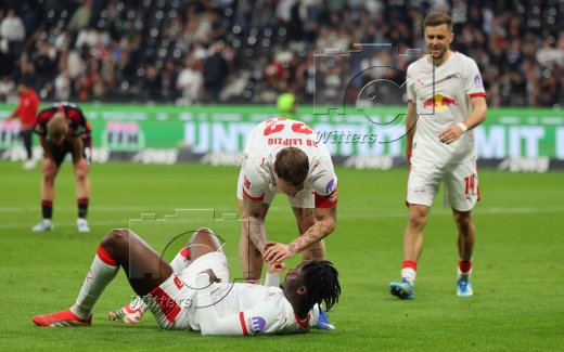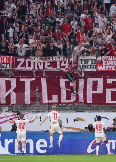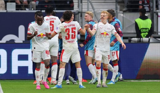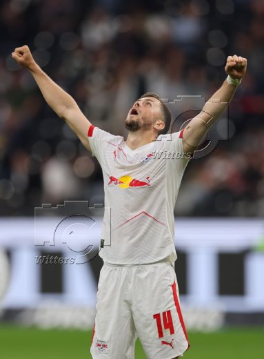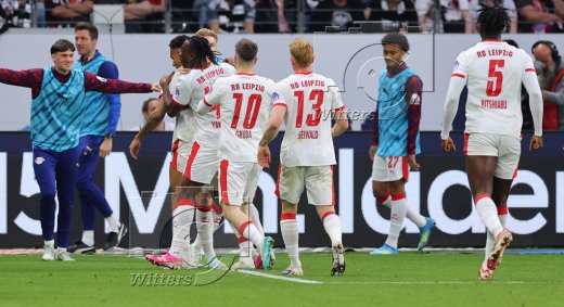 Schlussjubel v.l. Torwart Maarten Vandevoordt (Leipzig), Benjamin Henrichs, Yan Diomande, Nicolas Seiwald, Ridle Baku, El Chadaille Bitshiabu