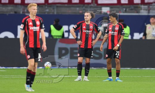 v.l. Hugo Larsson, Arthur Theate, Nathaniel Brown (Frankfurt) nach dem 1:2 Tor