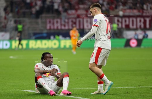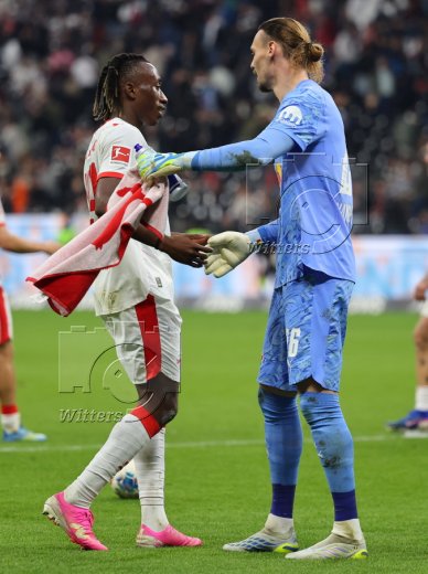 Schlussjubel v.l. Yan Diomande, Torwart Maarten Vandevoordt (Leipzig)