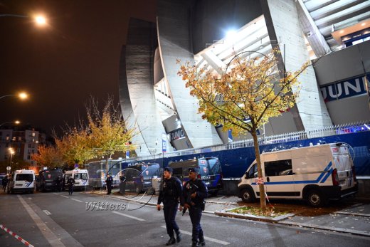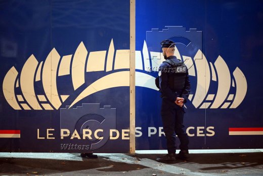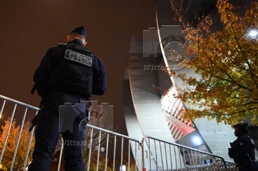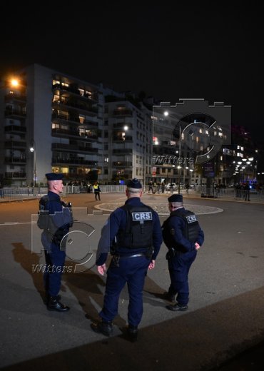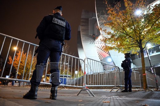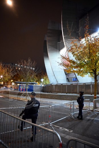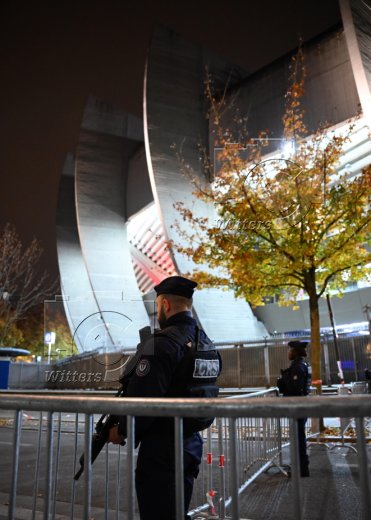Polizisten vor dem Prinzenparkstadion (Parc des Princes) am 10. Jahrestag der Terroranschlaege von Paris