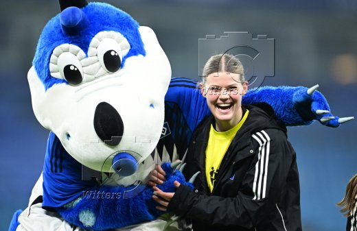 Schlussjubel v.l. Maskottchen Dino Hermann, Torfrau Lea Paulick (HSV)