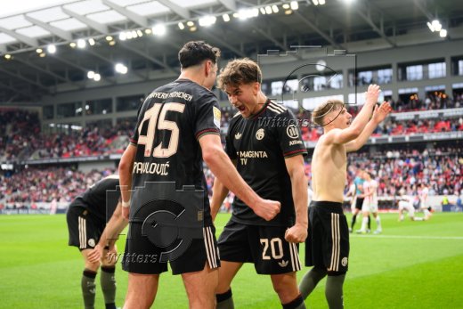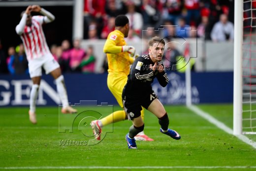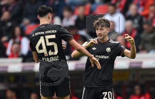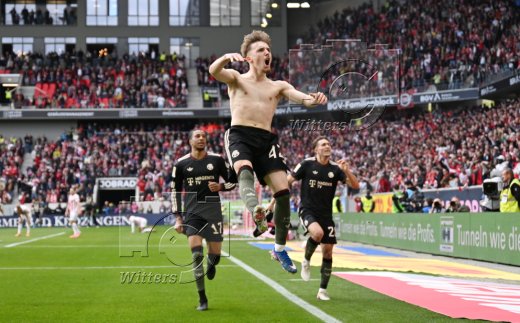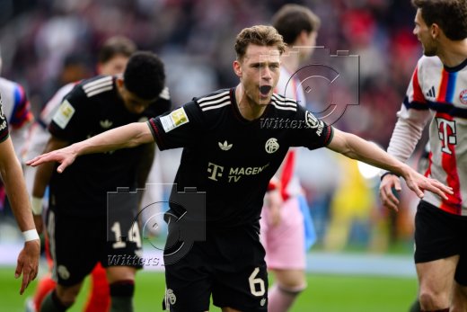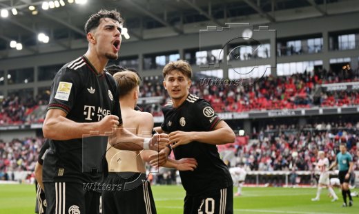 2:3 Tor, Jubel, v.l. Aleksandar Pavlovic, Torschuetze Lennart Karl, Tom Bischof (Bayern)