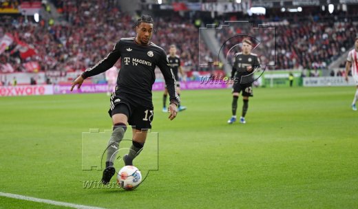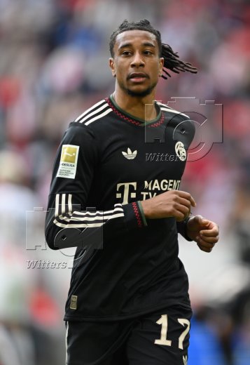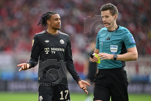 v.l. Michael Olise (Bayern, gelbe Karte), Schiedsrichter Daniel Siebert