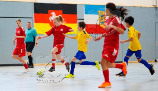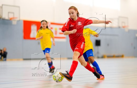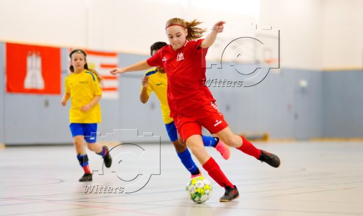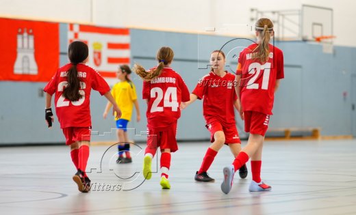 Pinneberg, 14.02.2026, Futsal, Norddeutscher Fussball-Verband NFV, Turnier U12 Maedchen, SV Eidelstedt Junioren 2015 (gelb) - Hamburger FV (rot)