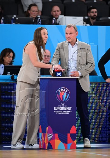 v.l. Turnierbotschafterin Svenja Brunckhorst (3x3 Basketball, Deutschland), Andy Grote (Senator fuer Inneres und Sport Hamburg)