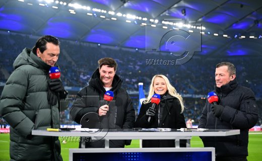 v.l. Moderator Sebastian Hellmann (Sky), Trainer Merlin Polzin (HSV), TV-Expertin Julia Simic, TV-Experte Lothar Matthaeus