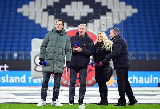 v.l. Moderator Sebastian Hellmann (Sky), Horst Hrubesch, TV-Expertin Julia Simic, TV-Experte Lothar Matthaeus