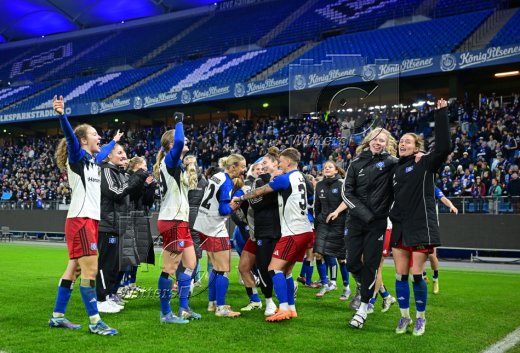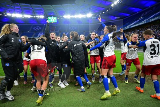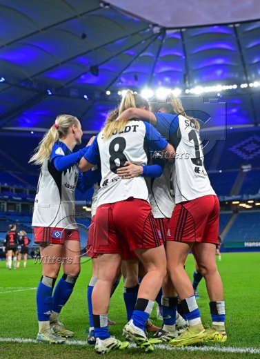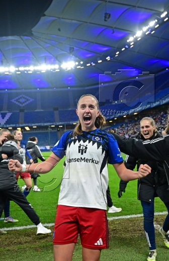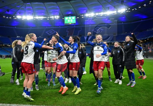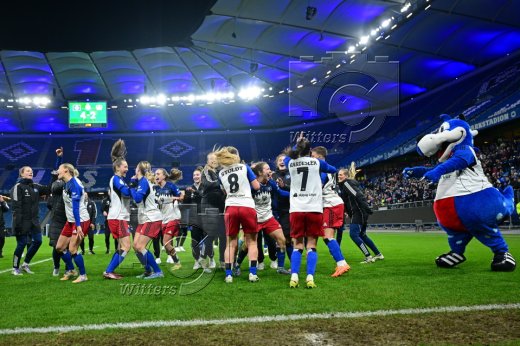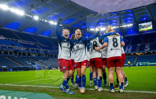 Schlussjubel, Victoria Schulz, Jobina Lahr, Pauline Machtens, Svea Stoldtm Leni Eggert, Torfrau Larissa Haidner (HSV)