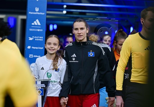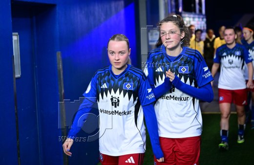 Auflaufen, v.l. Pauline Machtens, Torfrau Larissa Haidner (HSV), Svea Stoldt