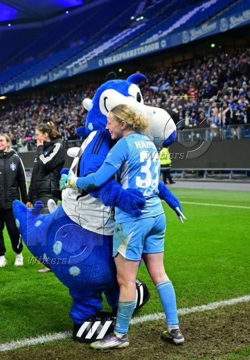 Schlussjubel, v.l. Maskottchen Dino Hermann, Torfrau Larissa Haidner (HSV)
