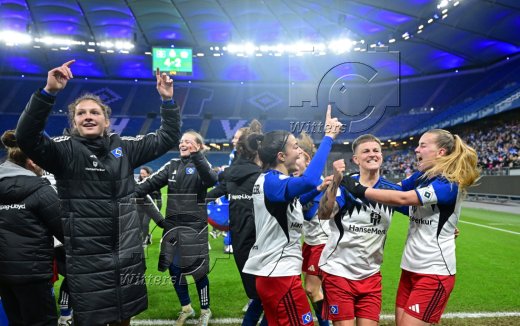 Schlussjubel, v.l. Sophie Hillebrand, Jobina Lahr, Victoria Schulz, Michela Croatto, Mia Buechele, Svea Stoldt (HSV)