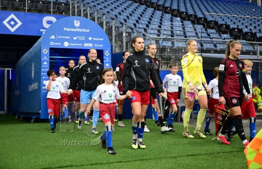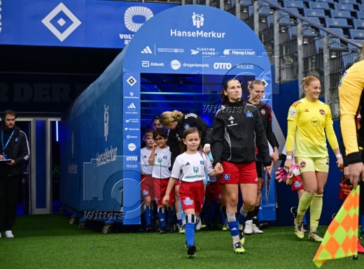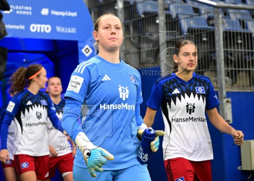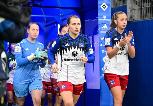 Auflaufen v.l. Torfrau Larissa Haidner (HSV), Pauline Machtens (HSV), Torfrau Larissa Rusek (Nuernberg)