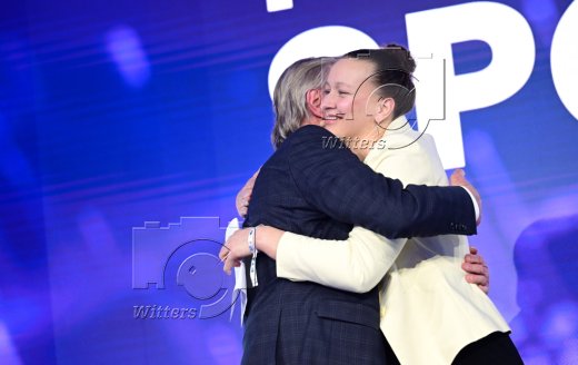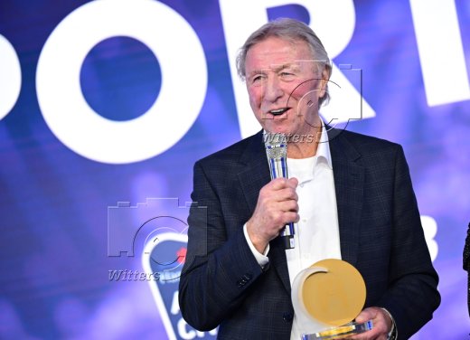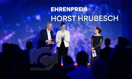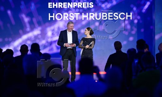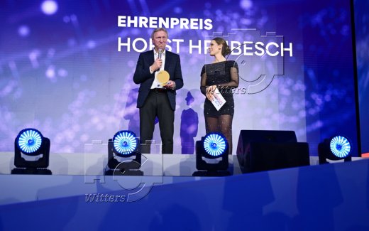 Ehrung Ehrenpreis, v.l. Gewinner Horst Hrubesch, Moderatorin Christina Rann