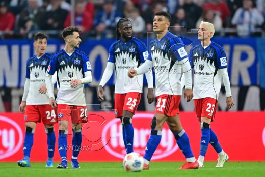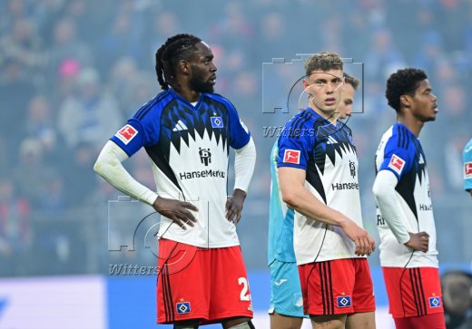 v.l. Nicolas Capaldo, Fabio Vieira, Jordan Torunarigha, Ransford-Yeboah Koenigsdoerffer, Albert Groenbaek (HSV) nach dem 1:2 Tor