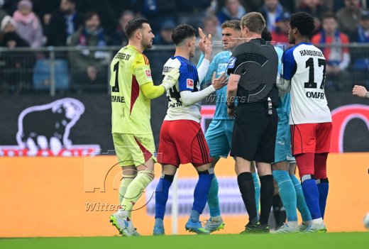Streit v.l. Torwart Daniel Heuer Fernandes (HSV), Nicolas Capaldo, Grischa Proemel (Hoffenheim), Schiedsrichter Robert Schroeder, Warmed Omari