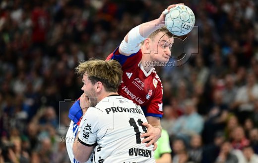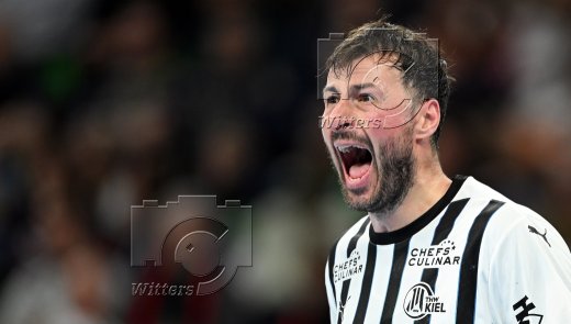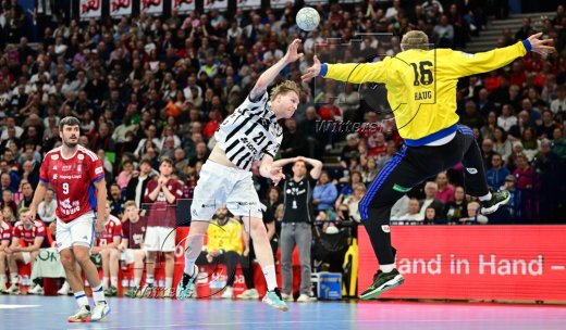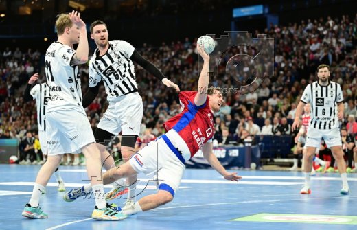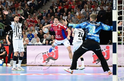 v.l. Domagoj Duvnjak, Kaj Geenen (Hamburg), Torwart Gonzalo Perez de Vargas (Kiel)