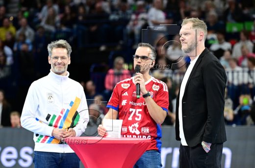 v.l. Steffen Ruelke (Leitung Vorprojekt Olympische und Paralympische Spiele in Hamburg), Moderator, Sportdirektor Johannes "Jogi" Bitter (Hamburg)