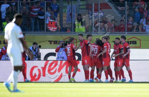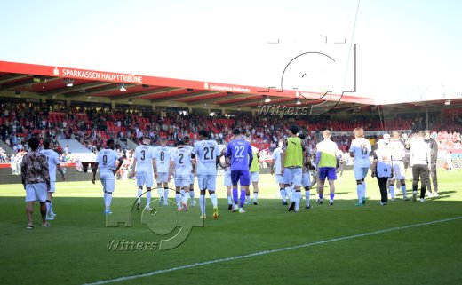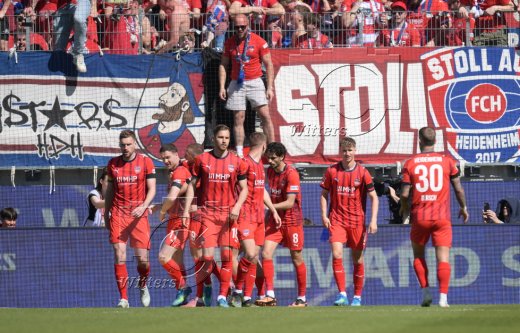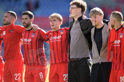 Schlussjubel, v.l. Arijon Ibrahimovic, Stefan Schimmer, Hannes Behrens (Heidenheim)