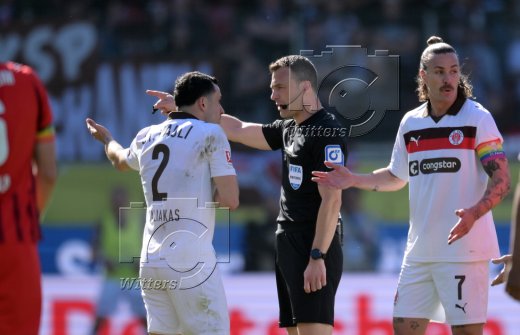 v.l. Manolis Saliakas (St. Pauli), Schiedsrichter Felix Zwayer, Jackson Irvine