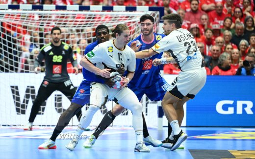 v.l. Matthes Langhoff, Hugo Descat (Frankreich), Torwart Andreas Wolff (Deutschland)