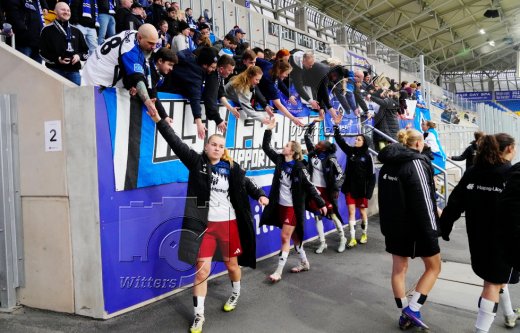 v.l. Svea Stoldt, Maria Mikolajova, Magou Doucoure, Lotta Wrede (HSV) bei den Fans